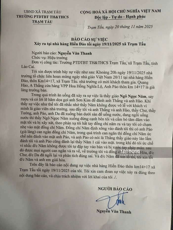 Ngày 23.11, mạng xã hội lan truyền thông tin vụ việc thầy giáo Trường Phổ thông dân tộc bán trú TH&THCS Trạm Tấu (xã Trạm Tấu, tỉnh Lào Cai) tố bị hiệu trưởng nhà trường say rượu, đánh nhập viện.